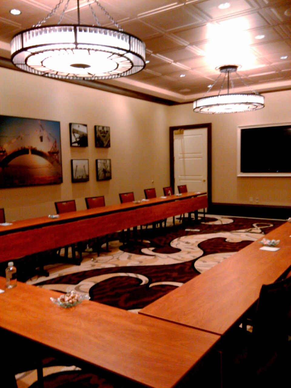 The property also has multiple meeting and event facilities that are great for conventions or weddings! How great are the big clock shaped light fixtures in this meeting room??